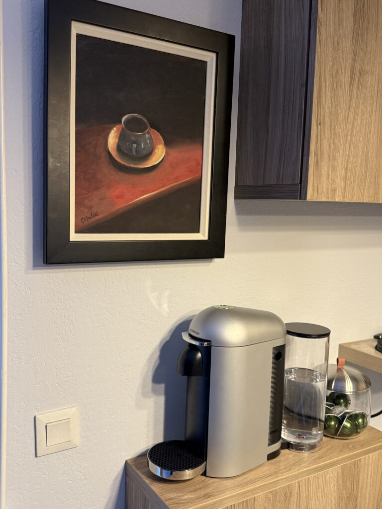 My favorite art placement in our home. The Coffee Cup was my first “real art” purchase in my 20’s and alas, the Nespresso machine came without George Clooney.