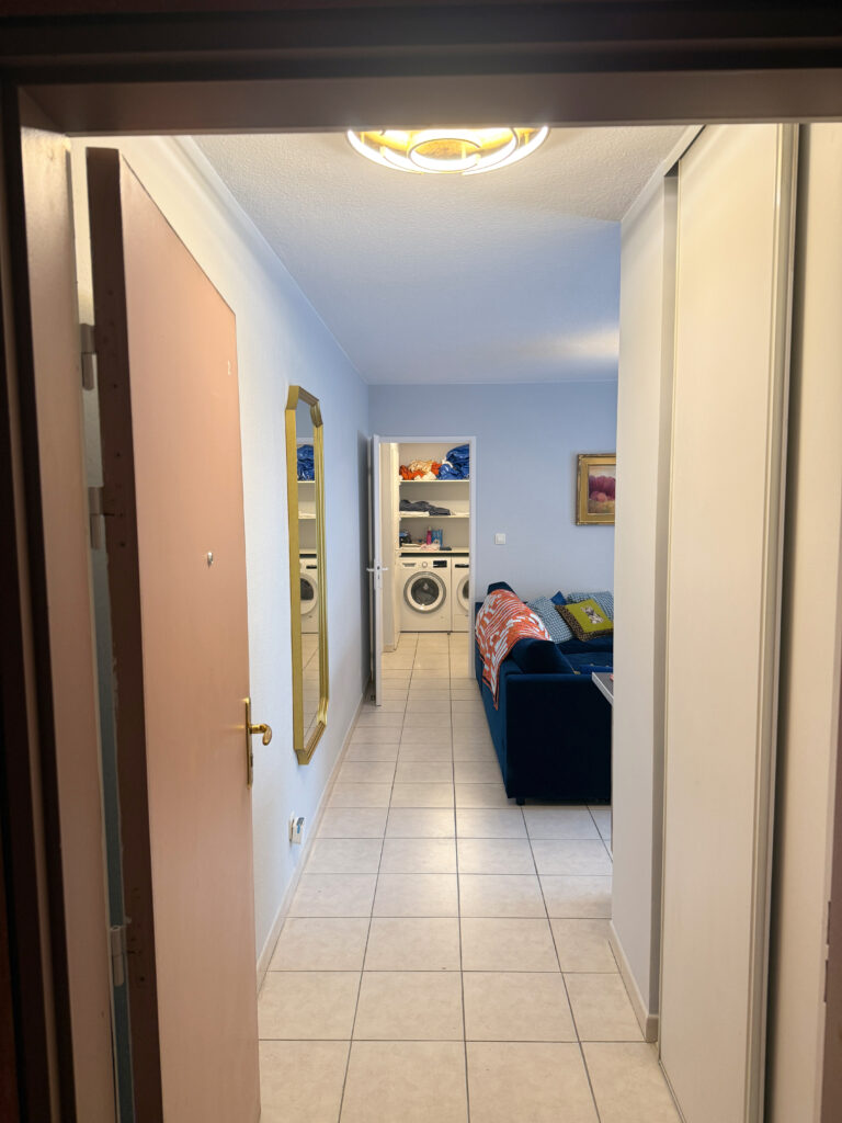 Yep, you can see clear through to the end of the apartment! First on the right is the living room and hidden is the kitchen. Further down, off to the left are our WC and shower room, and to the right, our bedroom.