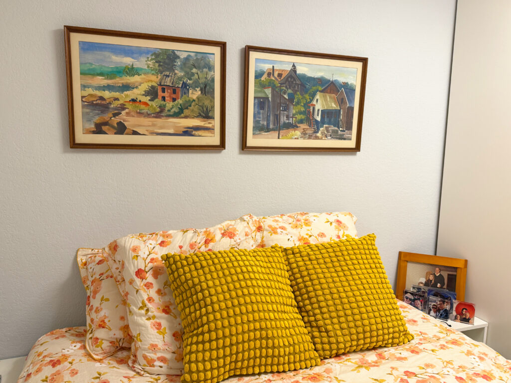 Note the two pieces of art above the bed. Presents to my parents for their wedding in their original frames, something I’ve looked at for my entire existence. And wonderfully suited to mimic the presence of a headboard without taking up the space.