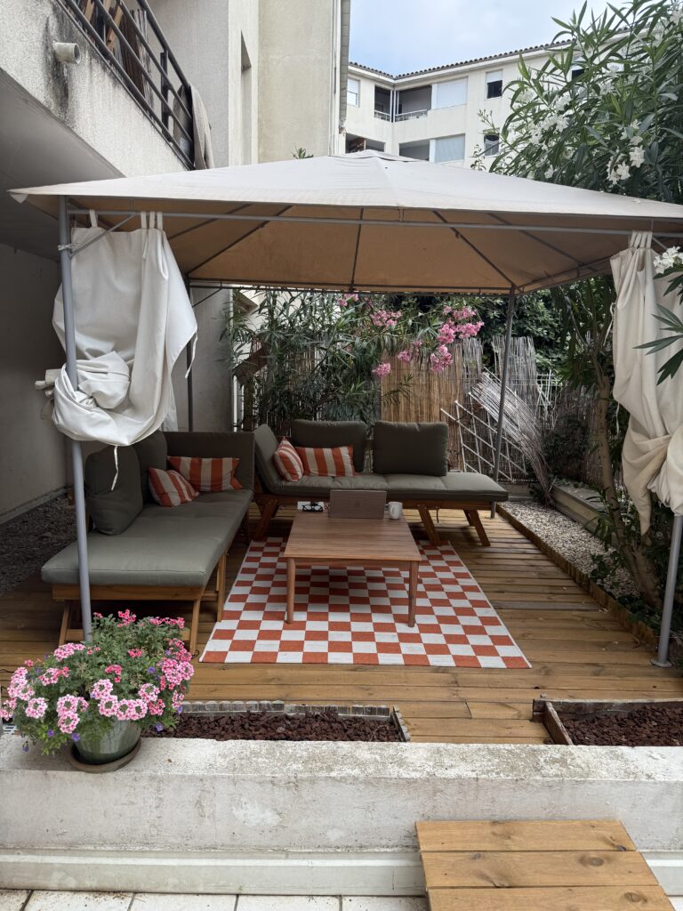 The terrace is divided into three parts: deck with awning, tiled terrace and garden. One of the renovations we did prior to moving in was have our contractor replace the dirt floor/wood slabs of the awning area with a concrete slab and wood decking. Benoit did an amazing job!
